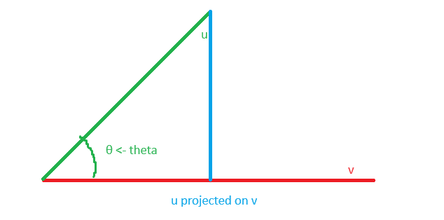 Projection onto a plane can be useful in a lot of circumstances although you’ll need to be creative to use it. It can be especially useful in a 3d environment. Anyways, continuing on let’s make it clear exactly what “projecting” means. If we have vector u and we want to know how far along it is on the axis that vector v travels down. Basically what this means is we’re trying to constrain our vector v to a length that matches exactly with the end of vector u. Here’s a picture to describe that.