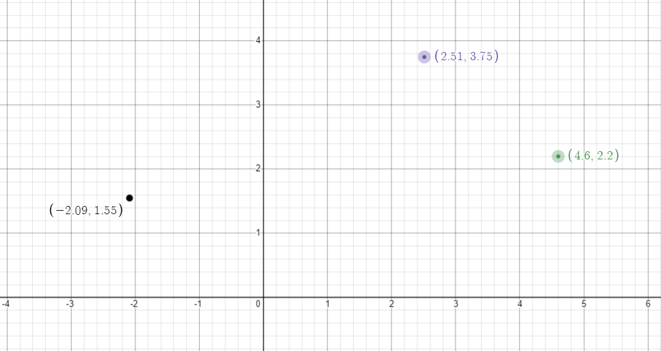 What do we get when we subtract these two positions from each other (purple - green)? We get some strange point way over here, but remember what I said before, subtraction describes the difference between two numbers and it describes the difference between two vectors and has the same magnitude as the distance between each. That point purple - green is the offset from zero that 0,0 is from black. We can prove that too. If we take black and add it to green we will get purple exactly!